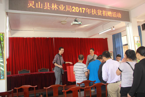 10月17日是我国第4个扶贫日,也是第25个国际消除贫困日。按照灵山县2017年扶贫日活动方案,县林业局于10月13日上午召开了扶贫捐赠动员会,谭超毅局长在会上作动员讲话指出,开展扶贫日活动,充分彰显中国共产党带领人民全面建成小康社会的信心决心,生动展示党和政府为消除贫困所做的巨大努力,大力弘扬扶贫济困传统美德和友善互助核心价值观,动员社会各界参与脱贫攻坚,进一步鼓舞士气,为实现脱贫攻坚目标、打赢脱贫攻坚战营造良好社会氛围;他要求干部职工要积极参与扶贫日的各项活动,提出扶贫捐赠倡议,希望大家为扶贫助困慷慨解囊,并在捐赠活动上身先士卒将捐款投进了捐款箱。在谭超毅局长的鼓动和带领下,干部职工们纷纷踊跃捐款,尽所能献爱心。